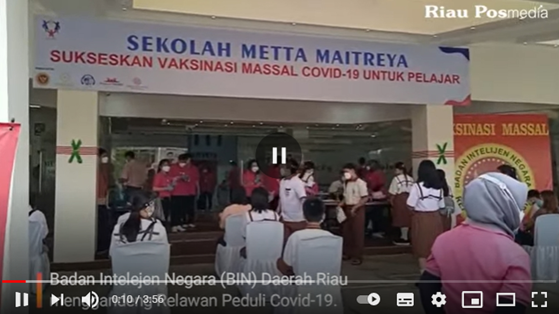 Badan Intelejen Negara (BIN) Daerah Riau menggandeng Relawan Peduli Covid-19. Melaksanakan vaksinasi masal untuk pelajar di sekolah swasta di Pekanbaru. Berlokasi di Sekolah Metta Maitreya Komplek Puri Nangka Sari, Jalan Tuanku Tambusai, Pekanbaru, Selasa (31/8/2021). Menurut Kabinda Riau BIN, Brigjen TNI Amino Setya Budi mengatakan, Vaksinasi masal lanjutan untuk santri dipusatkan di Ponpes Daarun Nahdhah Thawalib Bangkinang Kabupaten Kampar. Sementara untuk pelajar umum dipusatkan di Sekolah Yayasan Budha Metta Maitreya Riau. Sedangkan vaksinasi massal untuk masyarakat umum digelar di 12 kabupaten dan kota di Provinsi Riau. "Vaksinasi massal lanjutan hari ini dilaksanakan dengan target sebanyak 5.000 peserta di 12 Kabupaten / Kota di Provinsi Riau," Kata dia.