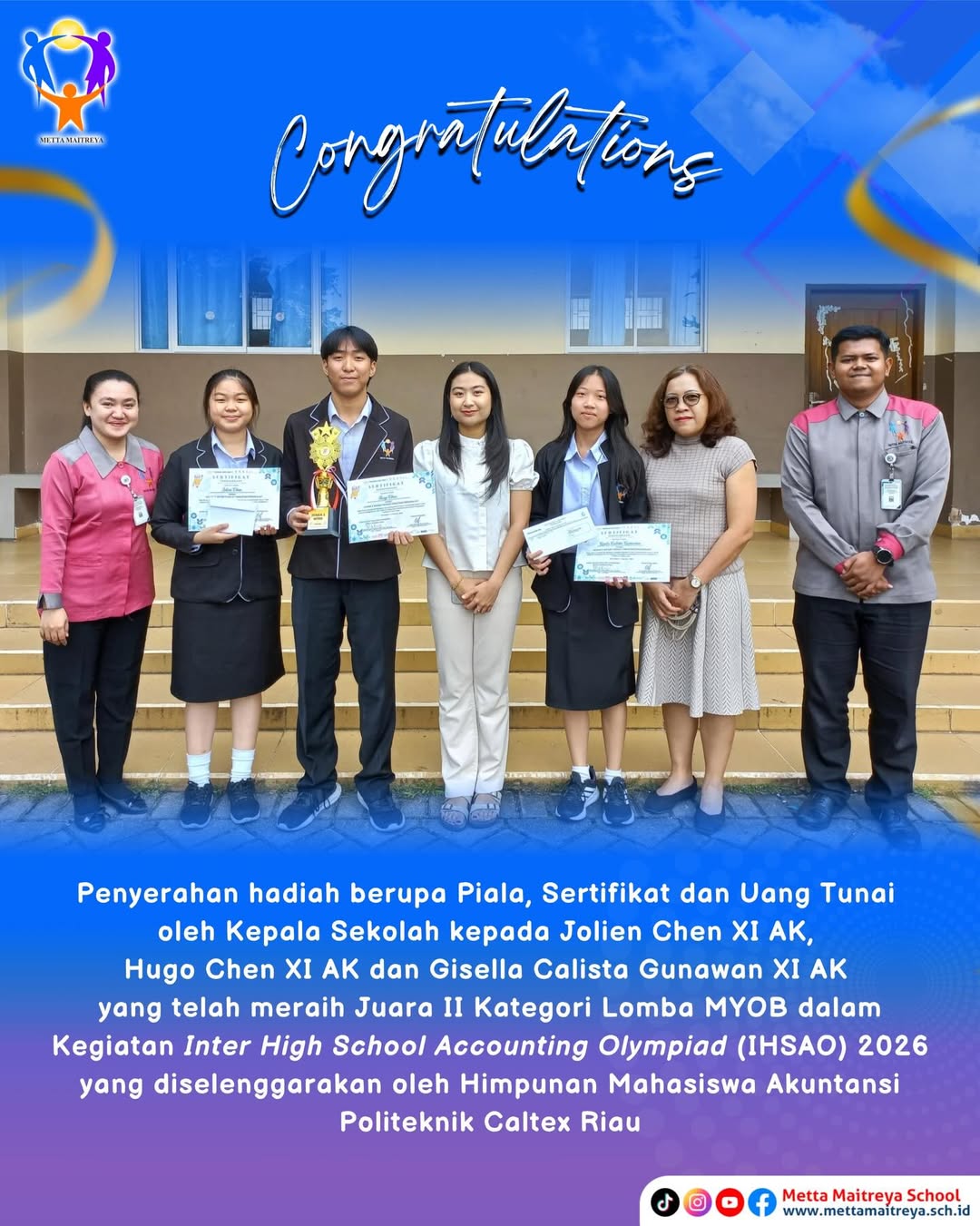 Kepala Sekolah kepada Gisella Calista Gunawan XI AK, Hugo Chen XI AK, Jolien Chen XI AK yang telah meraih Juara II Kategori Lomba MYOB dalam Kegiatan Inter High School Accounting Olympiad (IHSAO) 2026 yang diselenggarakan oleh Himpunan Mahasiswa Akuntansi Politeknik Caltex Riau