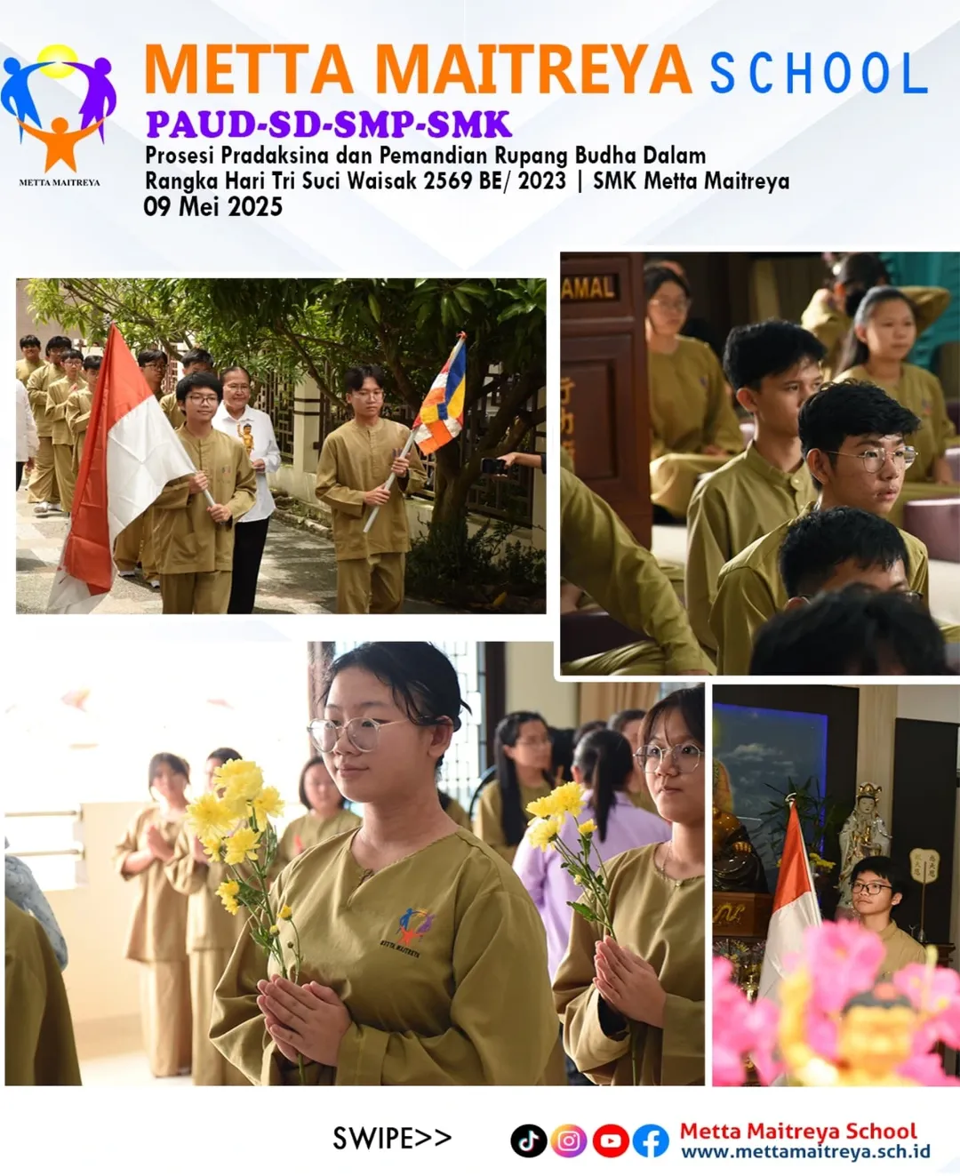 Dalam rangka memperingati Hari Tri Suci Waisak 2569 BE / 2025, peserta didik SMK Metta Maitreya mengikuti kegiatan prosesi Pradaksina dan pemandian rupang Buddha. Sebelum memulai rangkaian acara, para siswa menerima arahan dan penjelasan dari Ibu Pandita mengenai makna Waisak, yang mencakup kelahiran, pencerahan, dan wafatnya Sang Buddha, serta pentingnya menumbuhkan sikap welas asih, ketulusan, dan perilaku yang mulia. Kegiatan dilanjutkan dengan pelaksanaan Pradaksina, yaitu berjalan mengelilingi vihara sebagai bentuk penghormatan dan renungan atas Tiga Permata: Buddha, Dhamma, dan Sangha. Setelah itu, para siswa secara tertib melakukan pemandian rupang buddha sebagai lambang pembersihan diri dari hal-hal negatif dan sebagai pengingat untuk senantiasa menjalani kehidupan yang bersih dalam pikiran, ucapan, dan perbuatan.