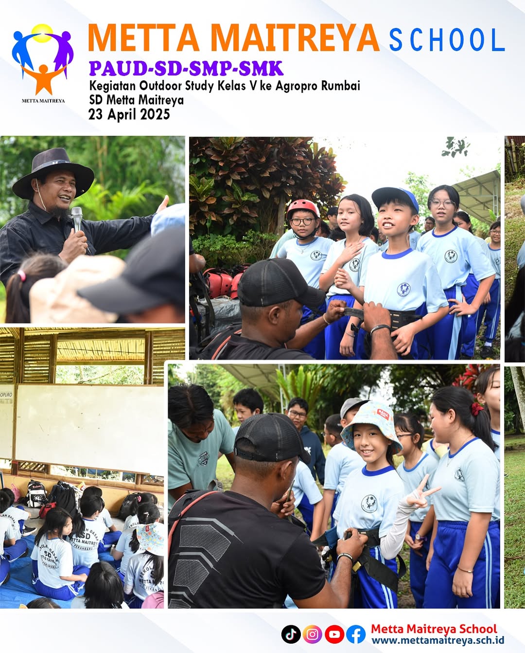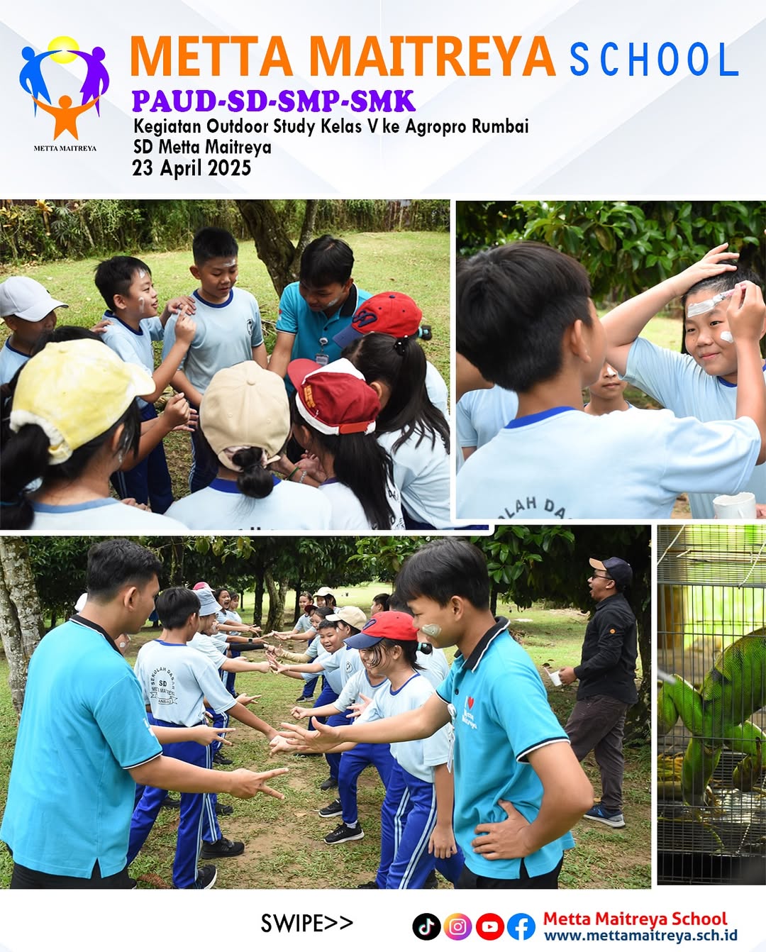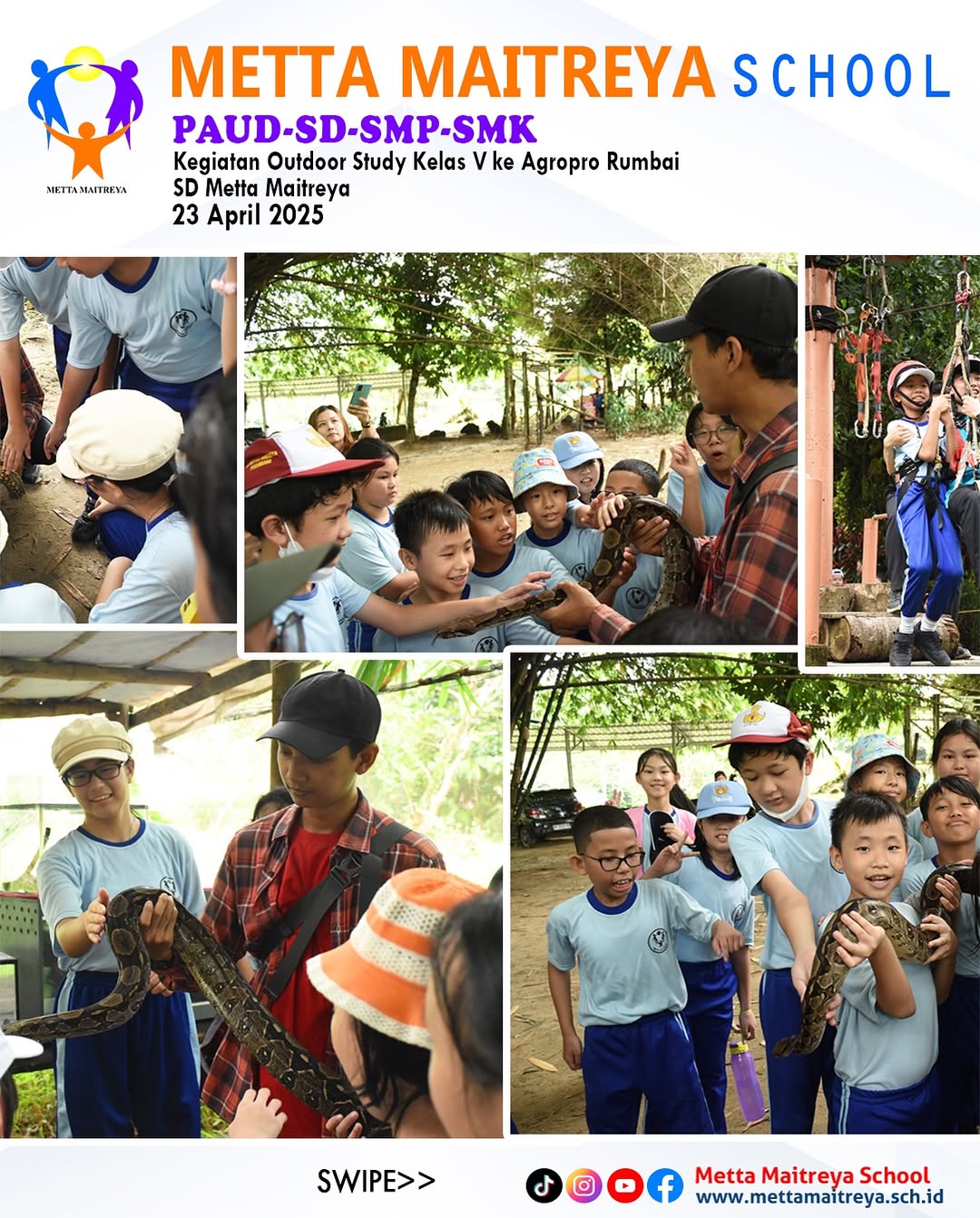 Outdoor Study Peserta didik kelas V ke Agropro Rumbai sebagai bagian dari pembelajaran luar kelas yang menyenangkan dan edukatif. Setibanya di lokasi, Peserta Didik mendapatkan pengarahan singkat dari petugas setempat sebelum dibagi menjadi empat tim untuk mengikuti berbagai kegiatan yang berbeda. Aktivitas yang dilakukan meliputi ice breaking, observasi sarang lebah, pengenalan berbagai jenis hewan reptil seperti ular, iguana, dan kura-kura, serta permainan flying fox yang diikuti oleh seluruh peserta didik. Kegiatan ini tidak hanya memberikan pengalaman baru yang menyenangkan, tetapi juga mempererat kebersamaan antar siswa. Setelah mengikuti rangkaian kegiatan, peserta didik menikmati makan bersama, dilanjutkan dengan berbagai permainan kelompok yang menambah keceriaan dan kebahagiaan mereka sepanjang hari.