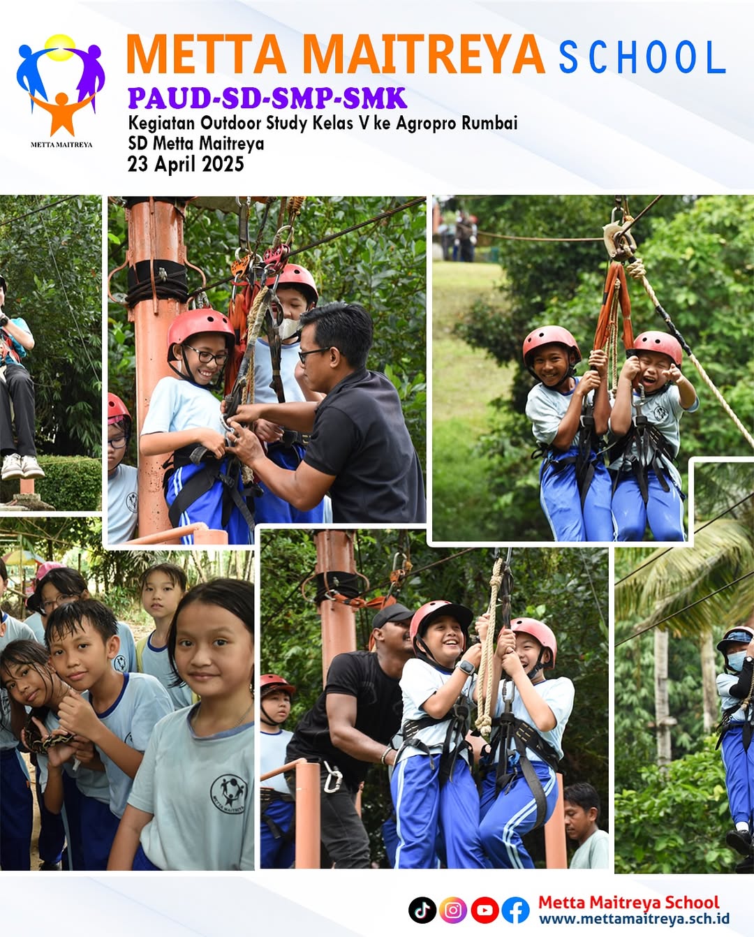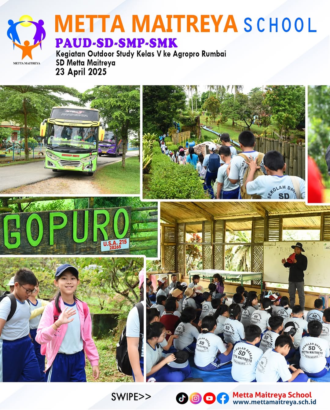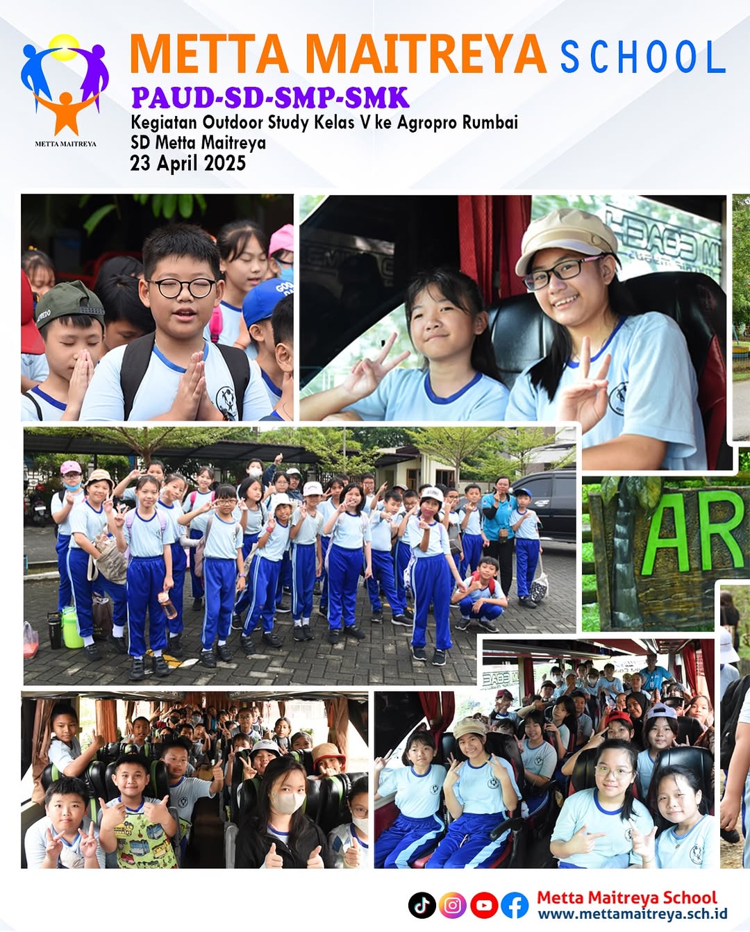 Outdoor Study Peserta didik kelas V ke Agropro Rumbai sebagai bagian dari pembelajaran luar kelas yang menyenangkan dan edukatif. Setibanya di lokasi, Peserta Didik mendapatkan pengarahan singkat dari petugas setempat sebelum dibagi menjadi empat tim untuk mengikuti berbagai kegiatan yang berbeda. Aktivitas yang dilakukan meliputi ice breaking, observasi sarang lebah, pengenalan berbagai jenis hewan reptil seperti ular, iguana, dan kura-kura, serta permainan flying fox yang diikuti oleh seluruh peserta didik. Kegiatan ini tidak hanya memberikan pengalaman baru yang menyenangkan, tetapi juga mempererat kebersamaan antar siswa. Setelah mengikuti rangkaian kegiatan, peserta didik menikmati makan bersama, dilanjutkan dengan berbagai permainan kelompok yang menambah keceriaan dan kebahagiaan mereka sepanjang hari.