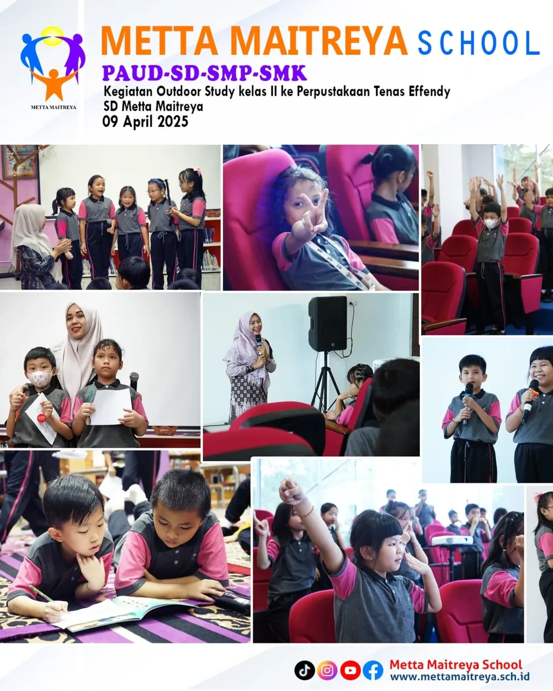 Kunjungan literasi ke perpustakaan Tenas Effendy menjadi pengalaman berharga bagi Peserta Didik kelas 2 SD Metta Maitreya. Dengan Antusias, mereka menjelajahi dunia lewat halaman-halaman buku. Tak hanya membaca, Peserta Didik juga diajak untuk menjelajahi sudut-sudut perpustakaan yang telah ditata sedemikian rupa agar ramah anak dan menarik perhatian. Beberapa Peserta Didik bahkan terlihat begitu asyik membaca buku cerita bergambar, buku dongeng, hingga ensiklopedia anak. Semoga langkah kecil ini menjadi awal besar menuju masa depan yang gemilang.