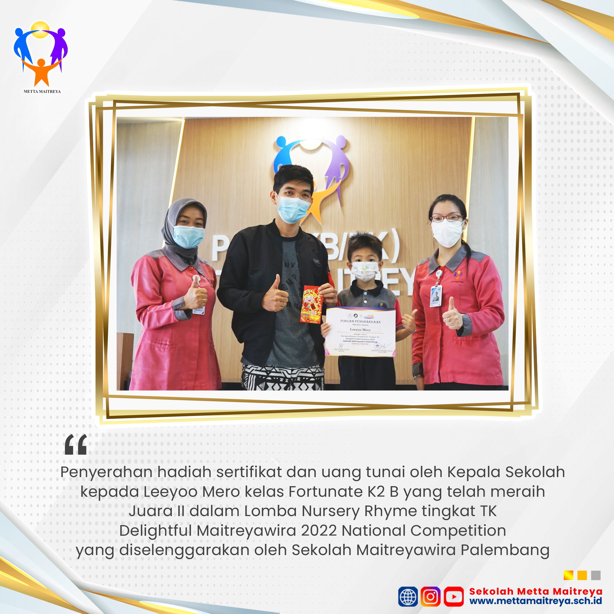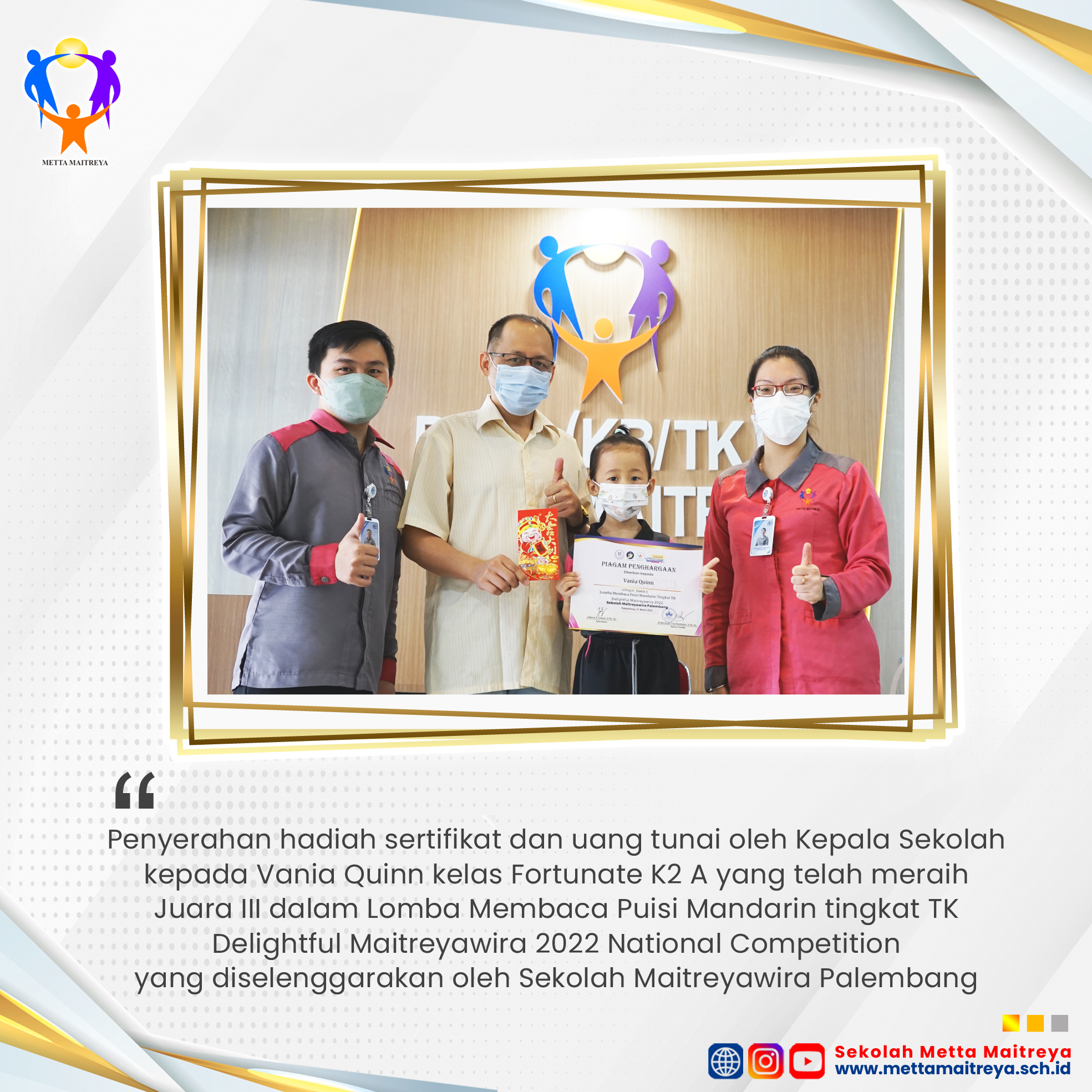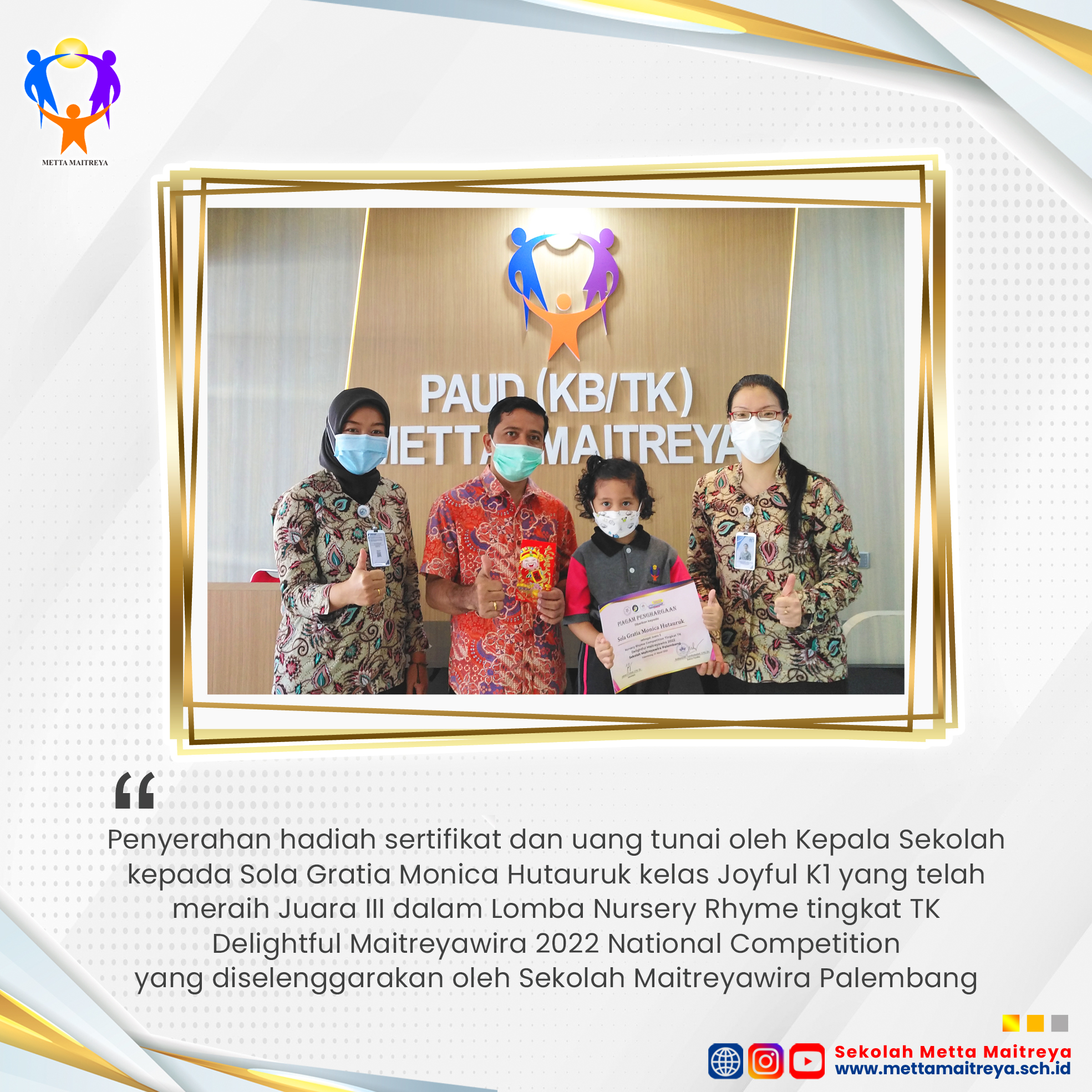 Penyerahan hadiah sertifikat dan uang tunai oleh Kepala Sekolah kepada Sola Gratia Monica Hutauruk kelas Joyful K1 yang telah meraih Juara III dalam Lomba Nursery Rhyme tingkat TK Delightful Maitreyawira 2022 National Competition yang diselenggarakan oleh Sekolah Maitreyawira Palembang