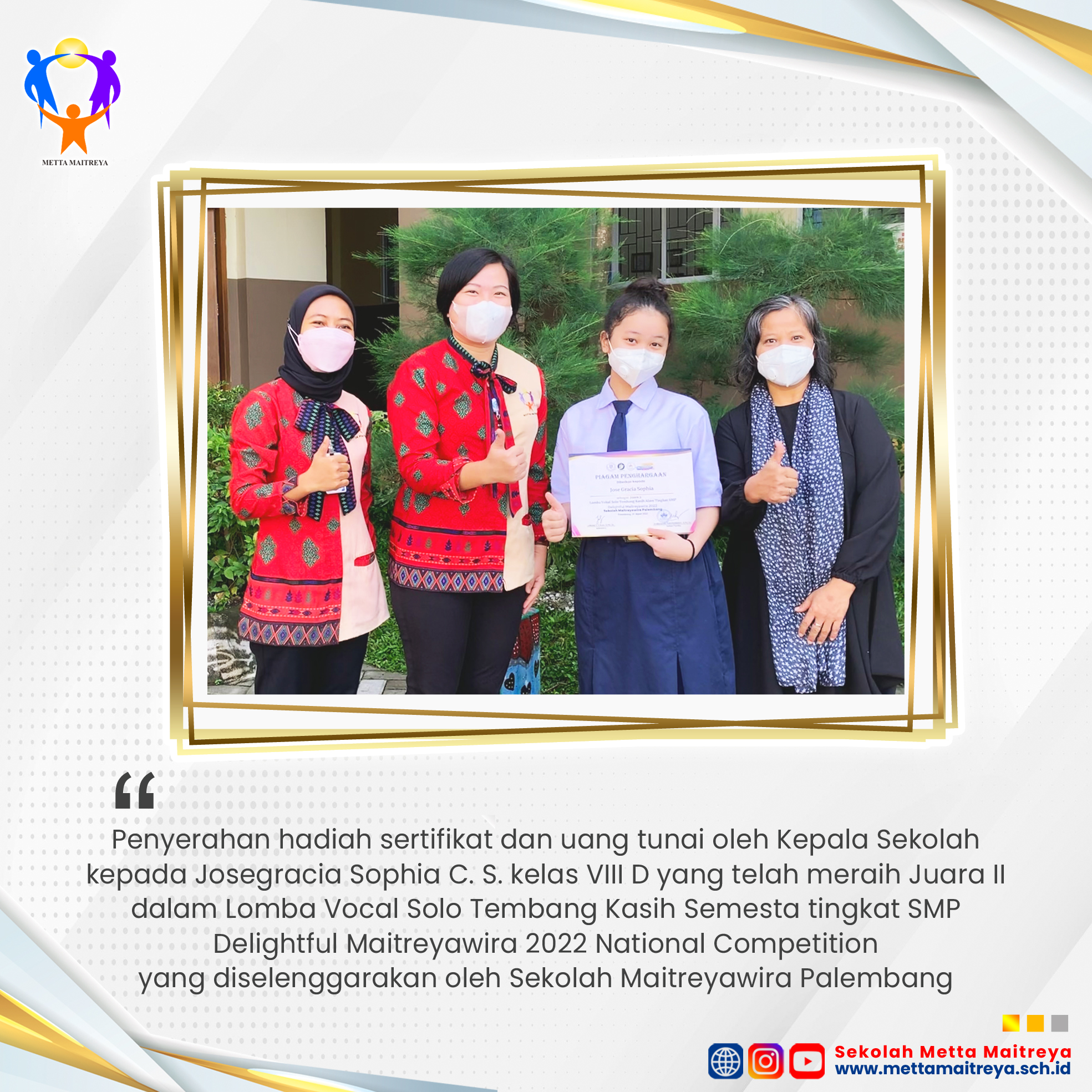 Penyerahan hadiah sertifikat dan uang tunai oleh Kepala Sekolah kepada Josegracia Sophia C. S. kelas VIII D yang telah meraih Juara III dalam Lomba Vocal Solo Tembang Kasih Semesta tingkat SMP Delightful Maitreyawira 2022 National Competition yang diselenggarakan oleh Sekolah Maitreyawira Palembang