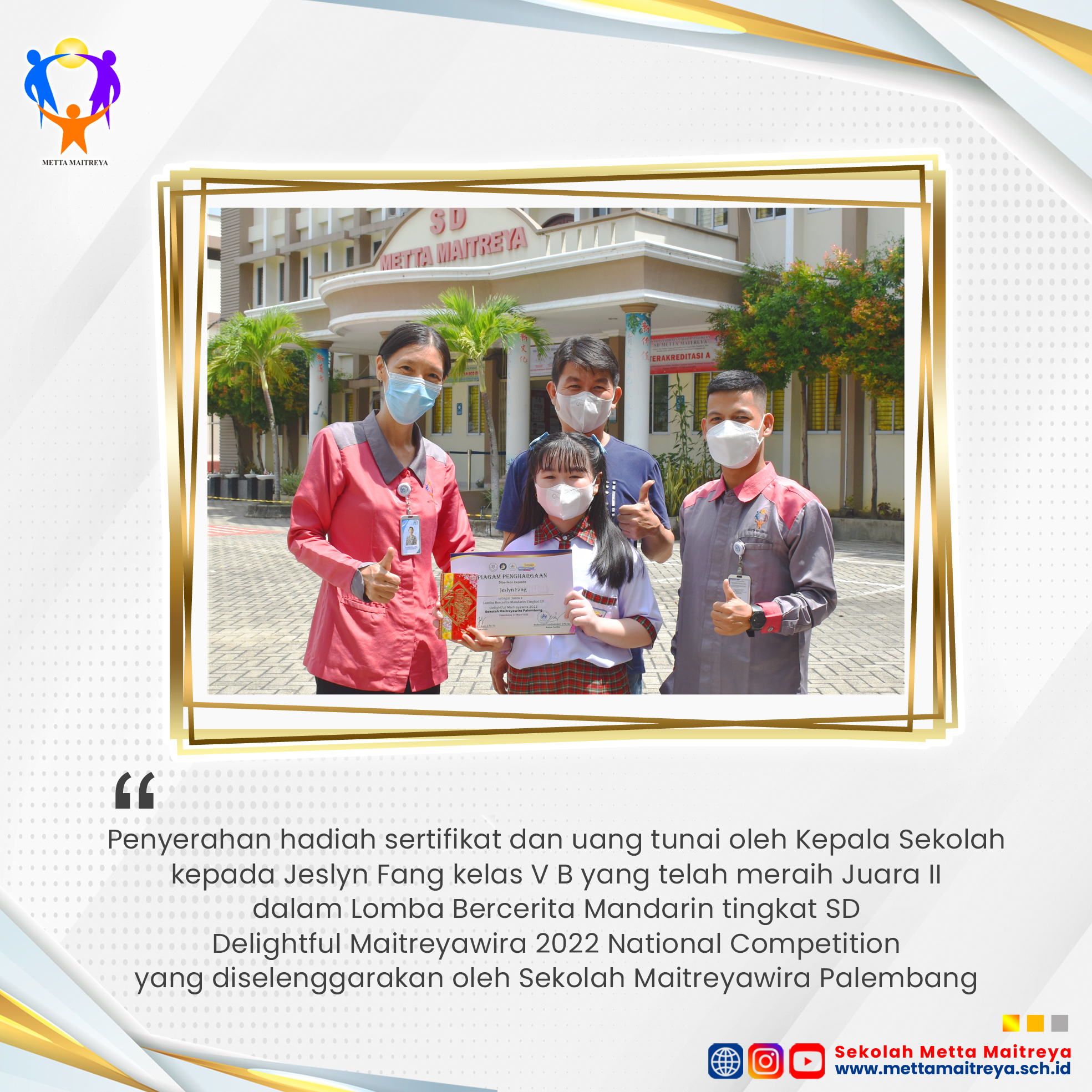 Penyerahan hadiah sertifikat dan uang tunai oleh Kepala Sekolah kepada Jeslyn Fang kelas V B yang telah meraih Juara II dalam Lomba Bercerita Mandarin tingkat SD Delightful Maitreyawira 2022 National Competition yang diselenggarakan oleh Sekolah Maitreyawira Palembang