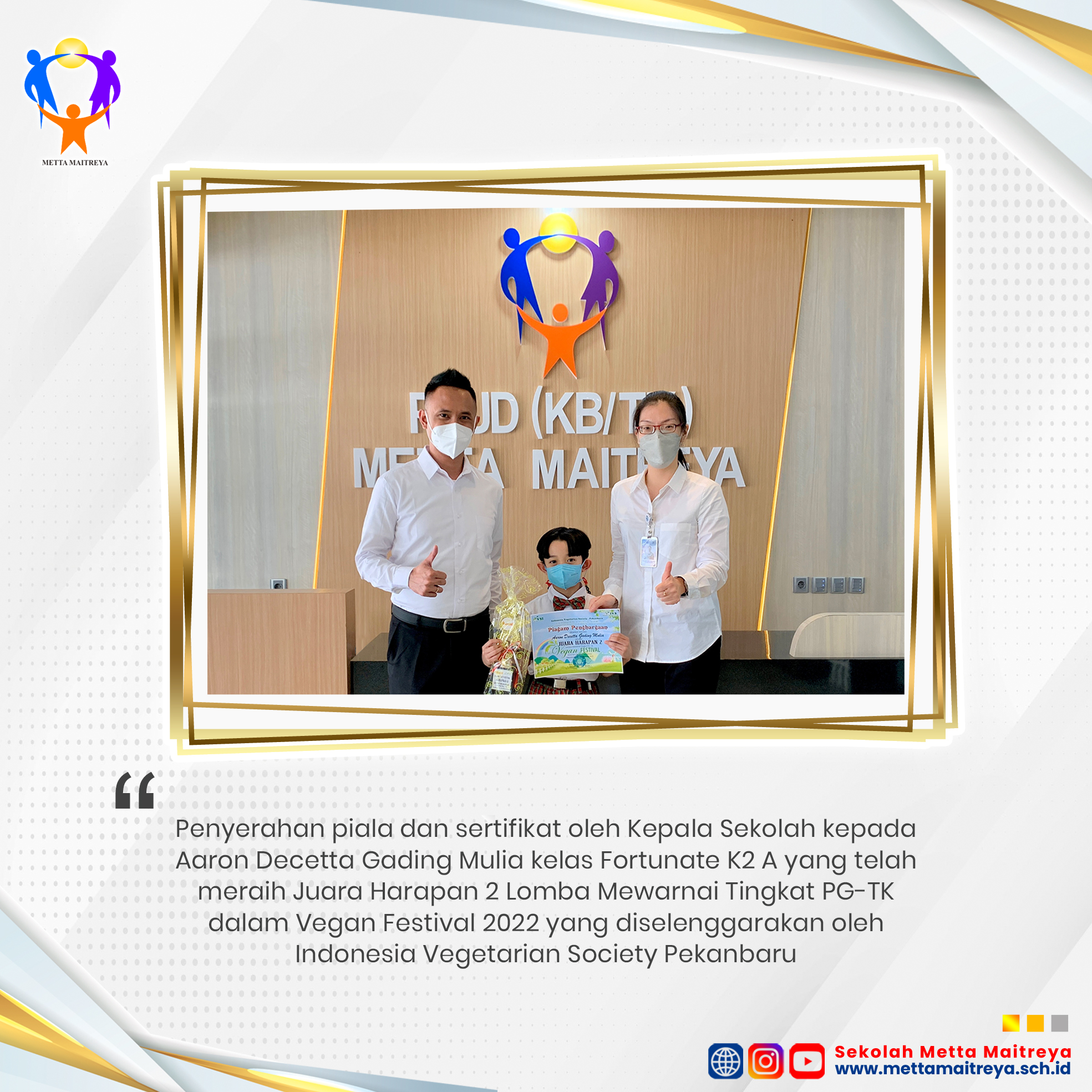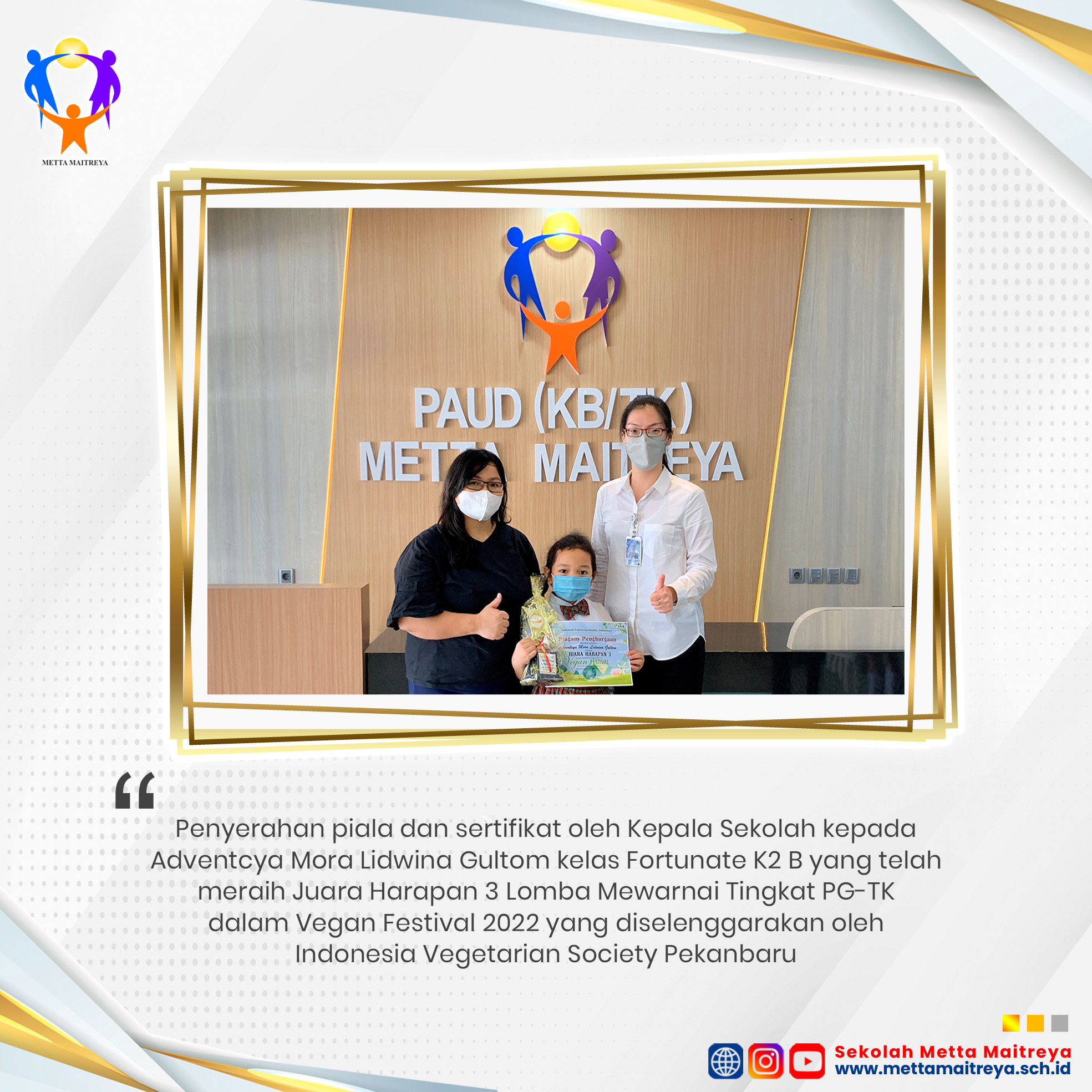 Selamat kepada peserta didik TK Metta Maitreya Aaron Decetta Gading Mulia kelas Fortunate K2 A yang telah meraih Juara Harapan 2 & Adventcya Mora Lidwina Gultom yang telah meraih Juara Harapan 3 Lomba Mewarnai Tingkat PG-TK dalam Vegan Festival yang diselenggarakan oleh Indonesia Vegetarian Society Pekanbaru