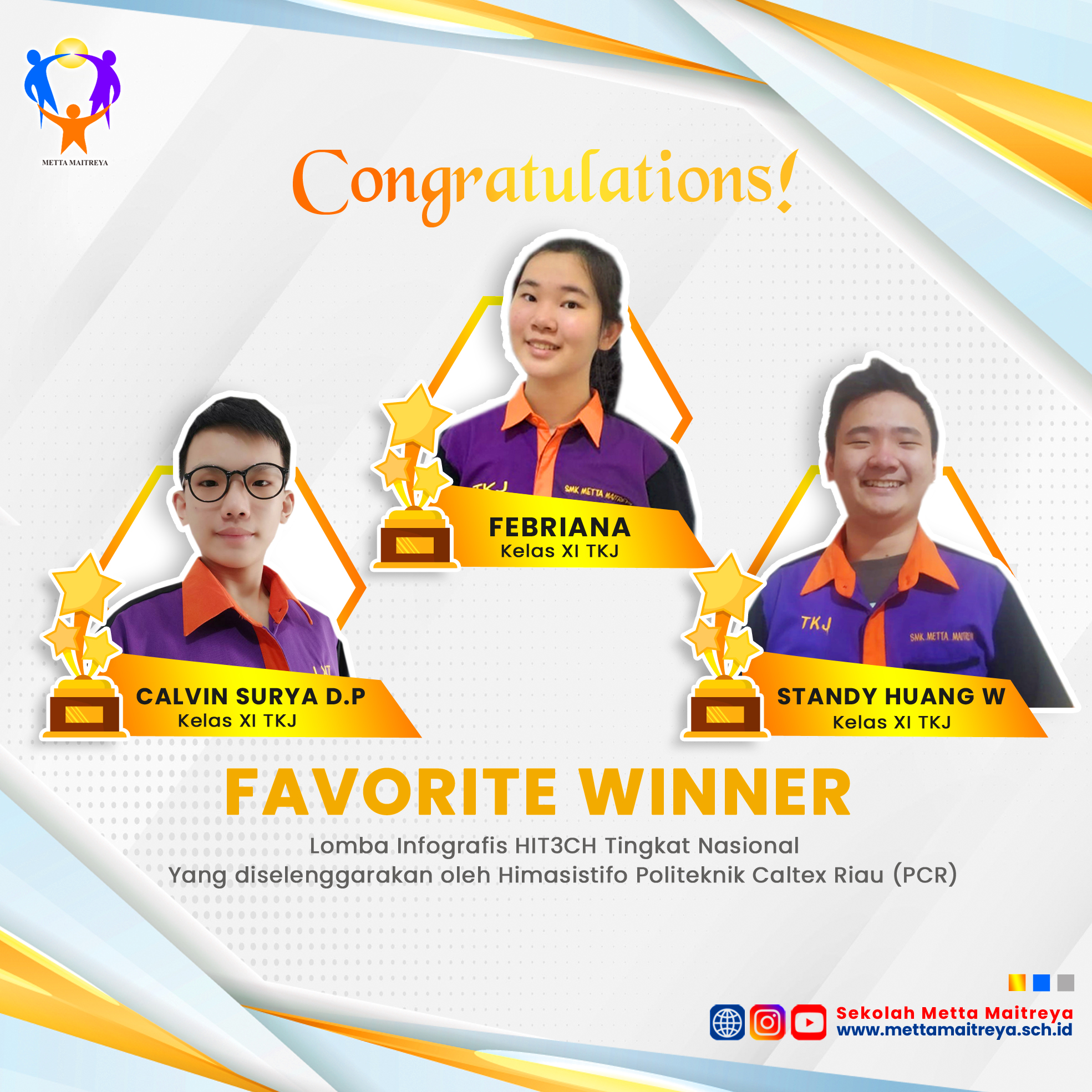 Selamat kepada peserta didik SMK Metta Maitreya yang telah meraih Juara I Lomba Business Case HIT3CH dan Juara Favorit Lomba InfoGrafis tingkat nasional yang diselenggarakan oleh Himasistifo Politeknik Caltex Riau (PCR)
