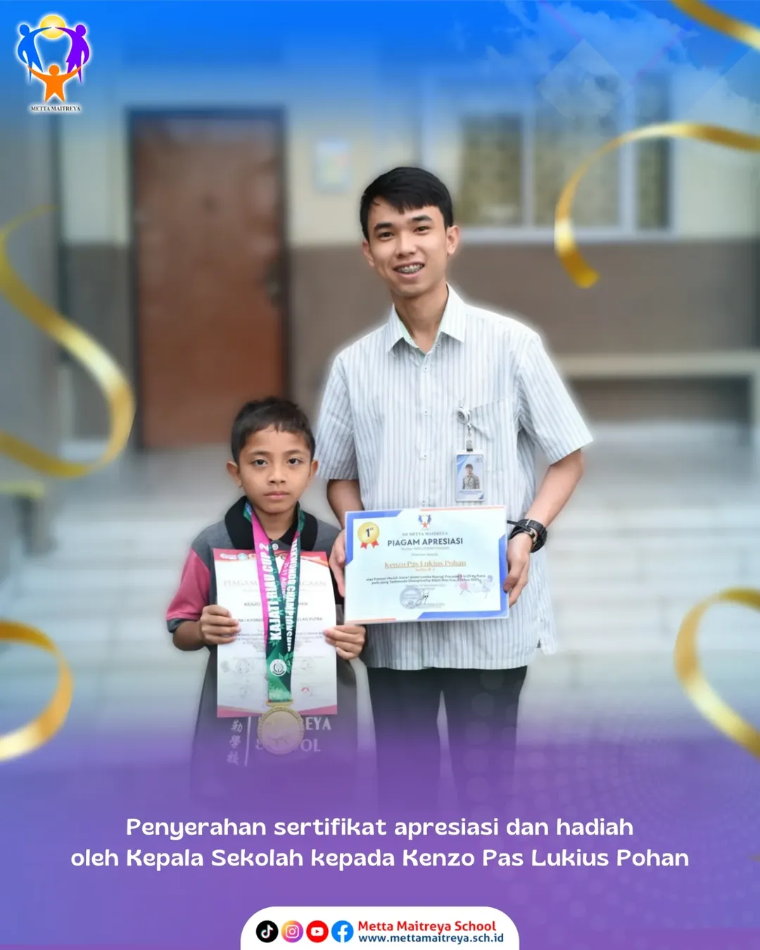 Selamat kepada peserta didik SD Metta Maitreya kenzo pas lukius pohan II A yang telah meraih Juara I Kategori Lomba Kyorugi Pracadet B U-23 KG Putra dalam kegiatan Taekwondo Championship Kajati Riau Cup 2 Tahun 2025 yang diselenggarakan oleh Dinas Kepemudaan dan Olahraga Provinsi Riau.